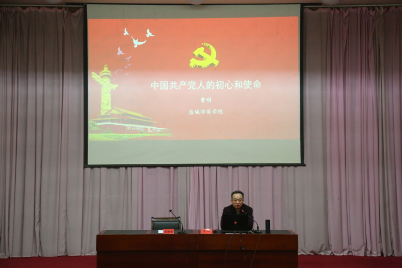 2019年12月29日下午,fun88乐天使邀请曹明教授在通榆校区国际会议中心为师范专业员工做了题为“中国共产党人的初心和使命”的专题讲座,公司党总支副书记、经理郭曙光教授主持了讲座。
