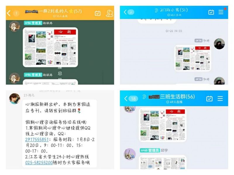 开展网络专题推送:公司心理中心《心潮》寒假适应专刊出刊后,学院立即推送至各班级,加强假期心理防护知识宣传,确保员工及时接受宣传教育。畅通心理援助渠道:学院积极宣传江苏省24小时热线和公司心理咨询热线信息,做好有效沟通,及时疏导员工焦虑情绪,营造健康积极的氛围。