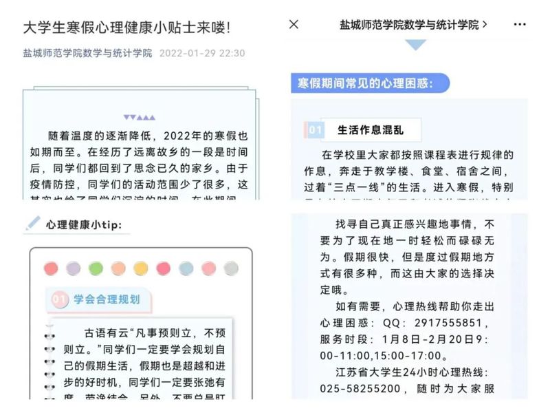 为帮助员工做好假期自我调适,学院通过微信公众号发布了寒假心理健康小贴士,提醒员工寒假容易发生的心理困惑,提供学会合理规划、培养沟通能力、丰富业余生活、假期自我调整等方面的建议,帮助员工更有意义地度过假期。