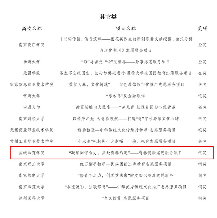 由共青团江苏省委、江苏省青年志愿者协会联合主办的2023年江苏省高校青年志愿服务项目大赛评选结果于近日公布。公司fun88乐天使申报的《“凝聚同伴合力,共赴青春约定”——青春健康志愿服务项目》获“其它类组”银奖。
